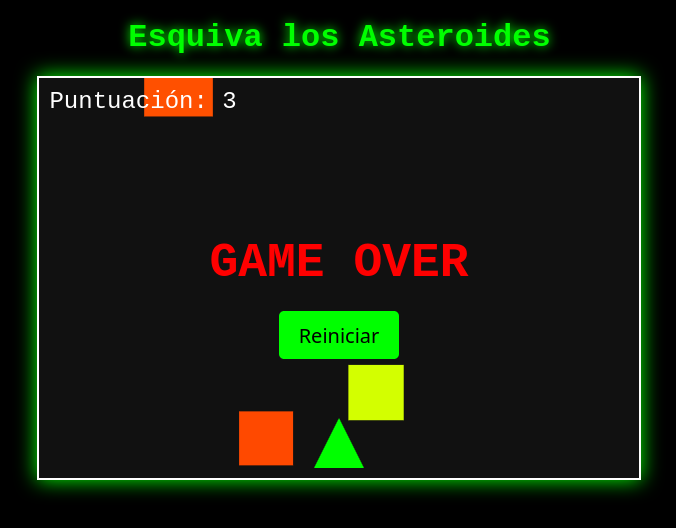 </head> <body> <h1>Esquiva los Asteroides</h1> <div id="game-container"> <canvas id="gameCanvas" width="600" height="400"></canvas> <div id="score">Puntuación: 0</div> <div id="game-over"> <h2>GAME OVER</h2> <button id="restart-button">Reiniciar</button> </div> </div>